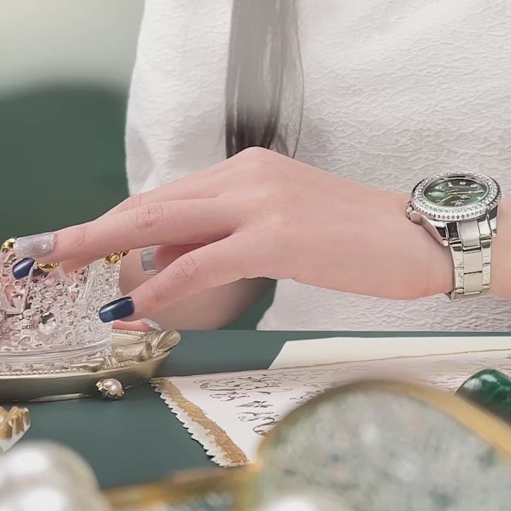- Elegant Diamond Design: Classic dial with sparkling diamond markers and a magnified date window.